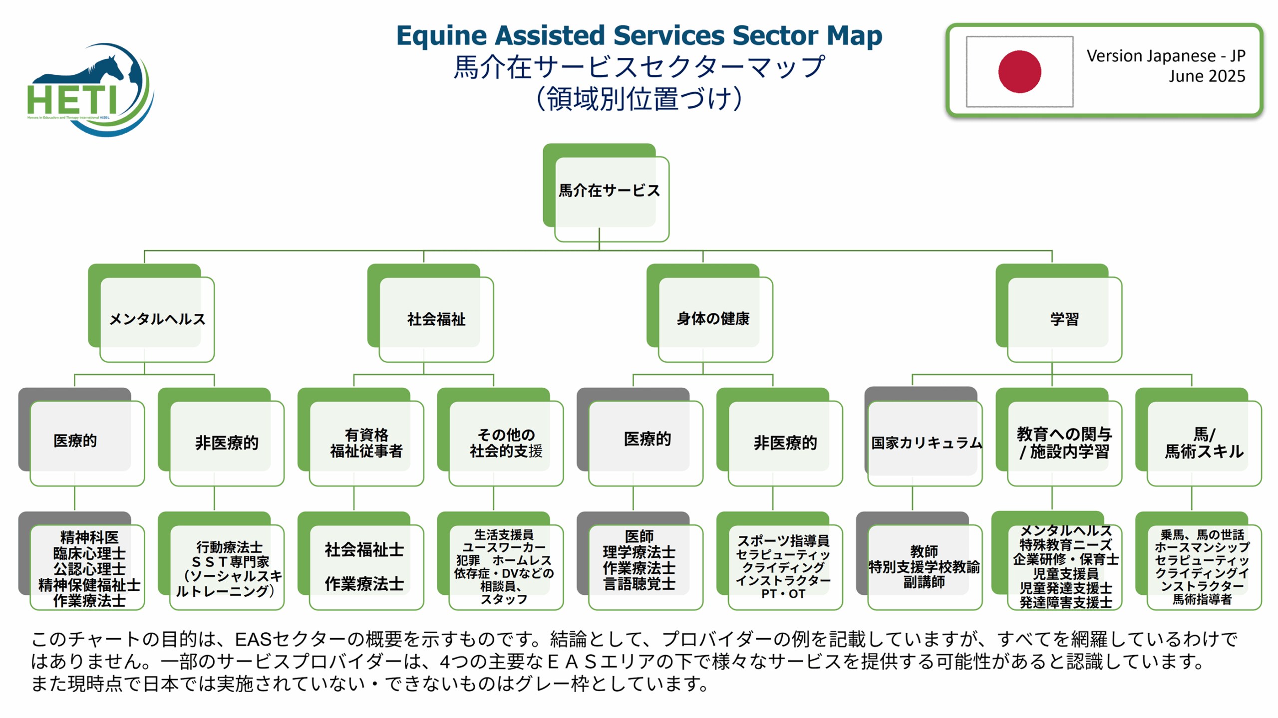 ここではHETI倫理委員会が策定したEAS(馬介在サービス)活動をするにあたっての提供者が遵守すべき倫理ガイドラインと馬の福祉と、EASにおけるセクターマップを掲載いたします。